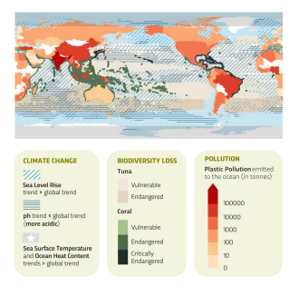 Oceán absorbuje 90 % přebytečného tepla způsobeného emisemi skleníkových plynů vyvolaných člověkem. Od 60. let 20. století se oteplování oceánů zrychluje, což naznačuje, že systém Země je v důsledku klimatických změn nebezpečně nevyvážený. Zpráva také zdůrazňuje, že oblasti s vysokou biologickou rozmanitostí se okyselují rychleji než je globální průměr, což má dopad na ohrožené druhy. Plastový odpad ze všech kontinentů znečišťuje všechny oceánské pánve.